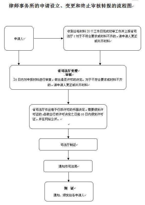 | 法定依据 | 《中华人民共和国律师法》 第十八条:设立律师事务所,应当向设区的市级或者直辖市的区人民政府司法行政部门提出申请,受理申请的部门应当自受理之日起二十日内予以审查,并将审查意见和全部申请材料报送省、自治区、直辖市人民政府司法行政部门。 《律师事务所管理办法》(司法部令2012年第125号) 第十六条:律师事务所的设立许可,由设区的市级或者直辖市的区(县)司法行政机关受理设立申请并进行初审,报省、自治区、直辖市司法行政机关进行审核,作出是否准予设立的决定。第十八条:设区的市级或者直辖市的区(县)司法行政机关对申请人提出的设立律师事务所申请,应当根据下列情况分别作出处理:(一)申请材料齐全、符合法定形式的,应当受理;(二)申请材料不齐全或者不符合法定形式的,应当当场或者自收到申请材料之日起五日内一次告知申请人需要补正的全部内容。申请人按要求补正的,予以受理;逾期不告知的,自收到申请材料之日起即为受理。(三)申请事项明显不符合法定条件或者申请人拒绝补正、无法补正有关材料的,不予受理,并向申请人书面说明理由。第二十四条:律师事务所变更名称、负责人、章程、合伙协议的,应当经所在地设区的市级或者直辖市的区(县)司法行政机关审查后报原审核机关批准。具体办法按律师事务所设立许可程序办理。律师事务所变更住所、合伙人的,应当自变更之日起十五日内经所在地设区的市级或者直辖市的区(县)司法行政机关报原审核机关备案。 |